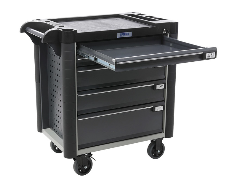 - Топ (пластик черного цвета) оснащён ложементами под инструменты для организации, хранения и удобства использования во время выполнения работ. Нагрузка на ТОП – 30 кг
